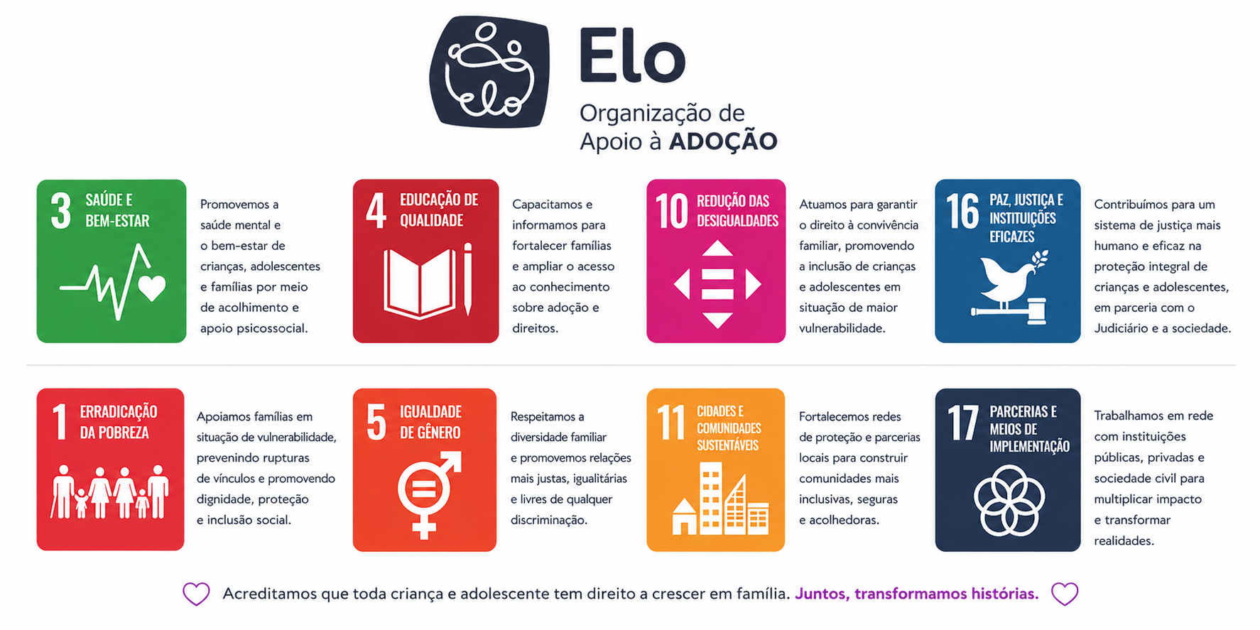 Somos uma organização da sociedade civil dedicada a lutar pelo direito à convivência familiar e comunitária de crianças e adolescentes. Trabalhamos incansavelmente para garantir que cada jovem tenha a oportunidade de crescer em um ambiente seguro e acolhedor. Localizados em Av. Anápio Gomes 1471, sala 302, Centro, Gravataí/RS, estamos aqui para oferecer suporte e assistência. Entre em contato conosco pelo telefone 51 99165-9537 ou pelo e-mail elo@eloadocao.org.br. Nosso horário de funcionamento é de segunda a sexta-feira, das 9h às 17h, com agendamento prévio.